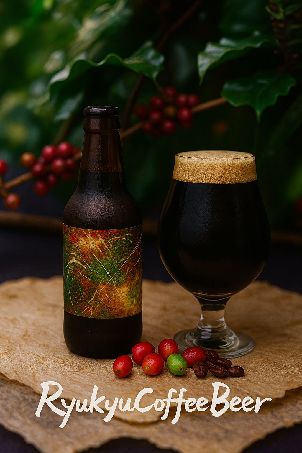 沖縄のロースタリー、農園さんから提供頂いたコーヒー豆とコーヒーチェリーを使用した、初となるコーヒービール(黒ビール)です。